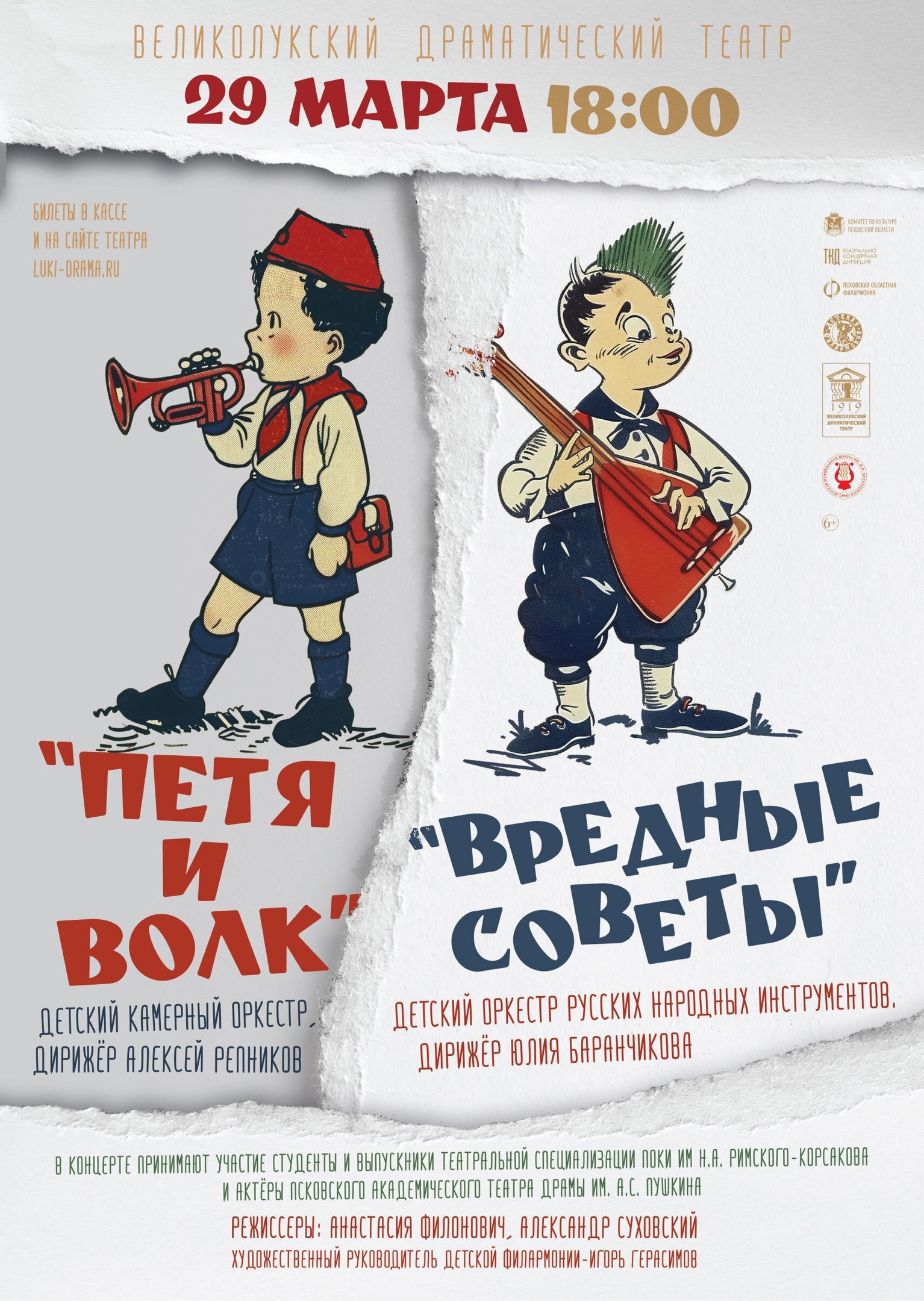29 марта в 18:00 на сцене Великолукского драматического театра выступят два оркестра: Детский камерный оркестр, под руководством Алексея Репникова, исполнит «Петю и Волк» С.С. Прокофьева, а Детский оркестр русских народных инструментов, дирижер Юлия Баранчикова, — «Вредные Советы» Г.Б. Остера. Обе программы будут представлены в форме театральных постановок с участием студентов и выпускников театрального отделения Псковского областного колледжа искусств имени Н. А. Римского-Корсакова, а также актеров Псковского академического театра драмы им. А.С. Пушкина.