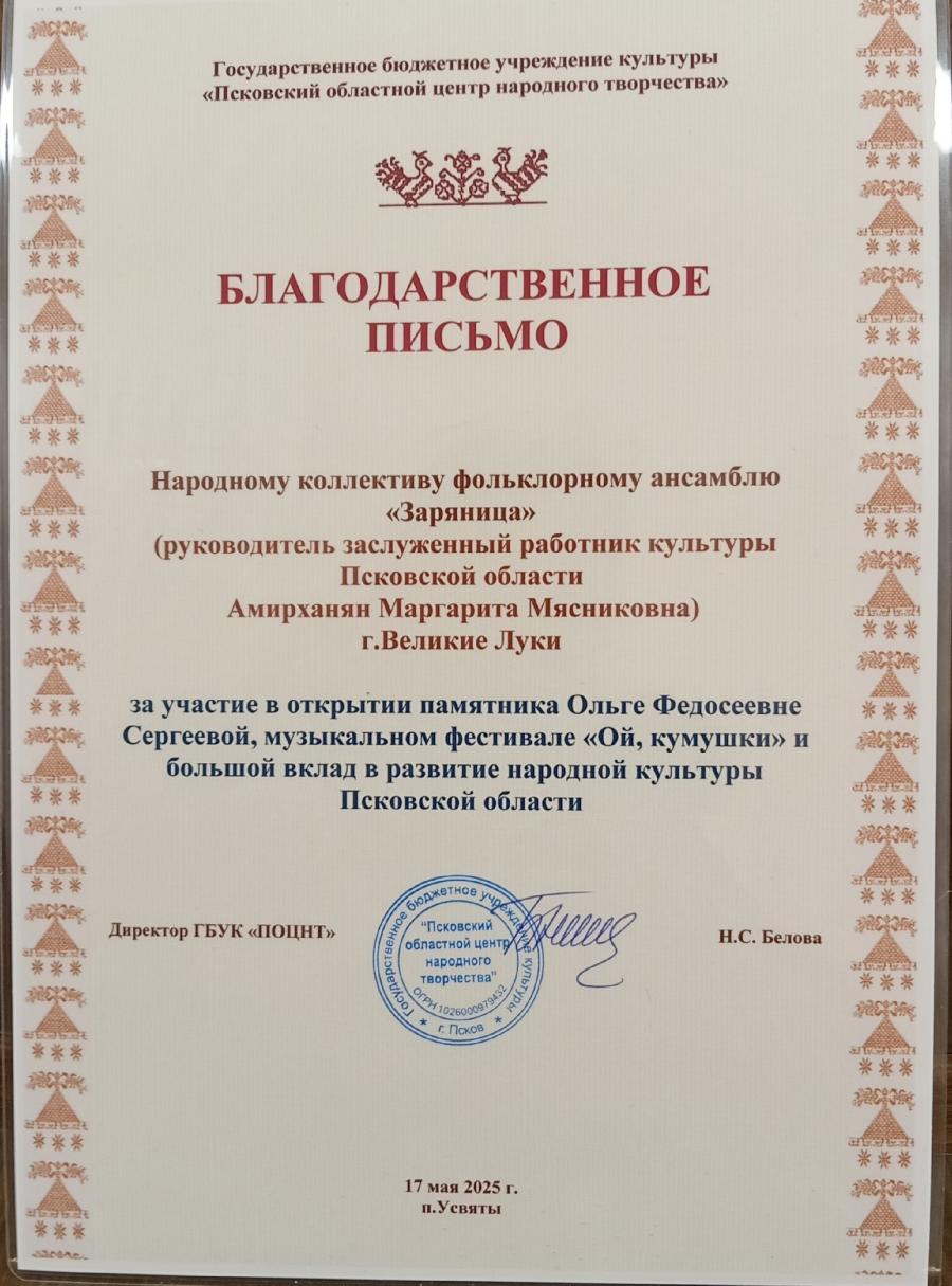 Помимо этого, участники фольклорного ансамбля «Заряница» приняли участие сразу в нескольких фестивалях в других регионах. В г. Санкт-Петербург на Межрегиональном фестивале «Кружания», ансамбль представлял дуэт Ореховой Анастасии и Ефимовой Ксении, который стал лауреатом I степени. Также выпускницы коллектива выступили на Фестивале Талантов в г. Великий Новгород и были удостоены диплома I степени.