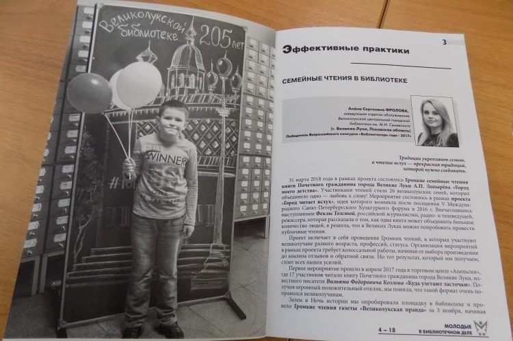 В профессиональном ежемесячном журнале №4 2018 года «Молодые в библиотечном деле» опубликована статья Алёны Фроловой, заведующей отделом обслуживания Великолукской центральной городской библиотеки имени М.И. Семевского, победителя Всероссийского конкурса «Библиотекарь года – 2017». Статья автора под названием «Семейные чтения в библиотеке» вошла в раздел «Эффективные практики» журнала и была посвящена юбилею Великолукской городской библиотеки – 205- летию, а также 110-летию со дня рождения Почетного гражданина города Великие Луки, краеведа - Андрея Павловича Лопырёва.