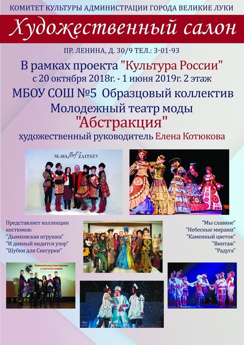 В экспозицию эксклюзивных подарков ручной работы «Жар-Птица» (0+) включены куклы-обереги, изделия из бисера, лозы и полимерной глины, авторские куклы, картины из шерсти. В рамках проекта «Культура России» работает выставка МБОУ СОШ №5 молодежного театра моды «Абстракция» «И дивный видится узор».