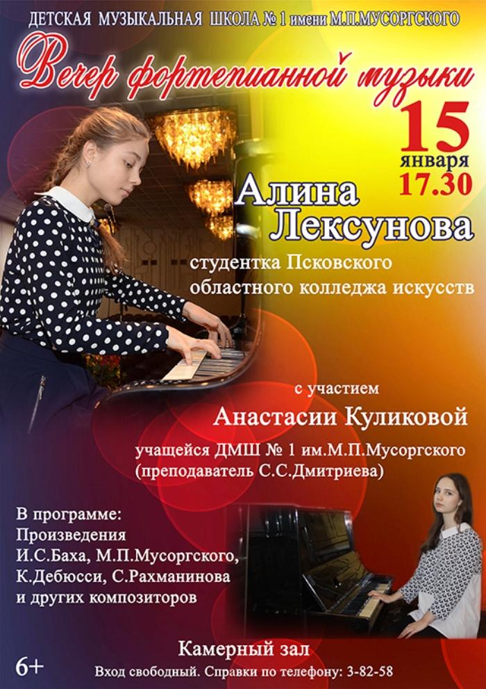 Завтра, 15 января, в 17.30, в камерном зале Детской музыкальной школы №1 имени М.П. Мусоргского состоится вечер фортепианной музыки Алины Лексуновой. Талантливая пианистка Алина Лексунова - студентка Псковского областного колледжа искусств. На вечере прозвучат классические произведения композиторов И.С. Баха, М.П. Мусоргского, С.В. Рахманинова и других.