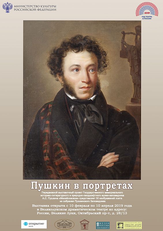 В воскресенье, 10 февраля, в 16.30 в фойе второго этажа Великолукского драматического театра состоится открытие передвижного выставочного проекта «Пушкин в портретах» Государственного мемориального историко-литературного и природно-ландшафтного музея-заповедника А.С. Пушкина «Михайловское». "Именно в этот день в 1837 году «завершилось земное бытие великого поэта земли русской Александра Пушкина, но его поэтический гений, его слава бессмертны», - так писал в письме друг поэта П.А. Вяземский.