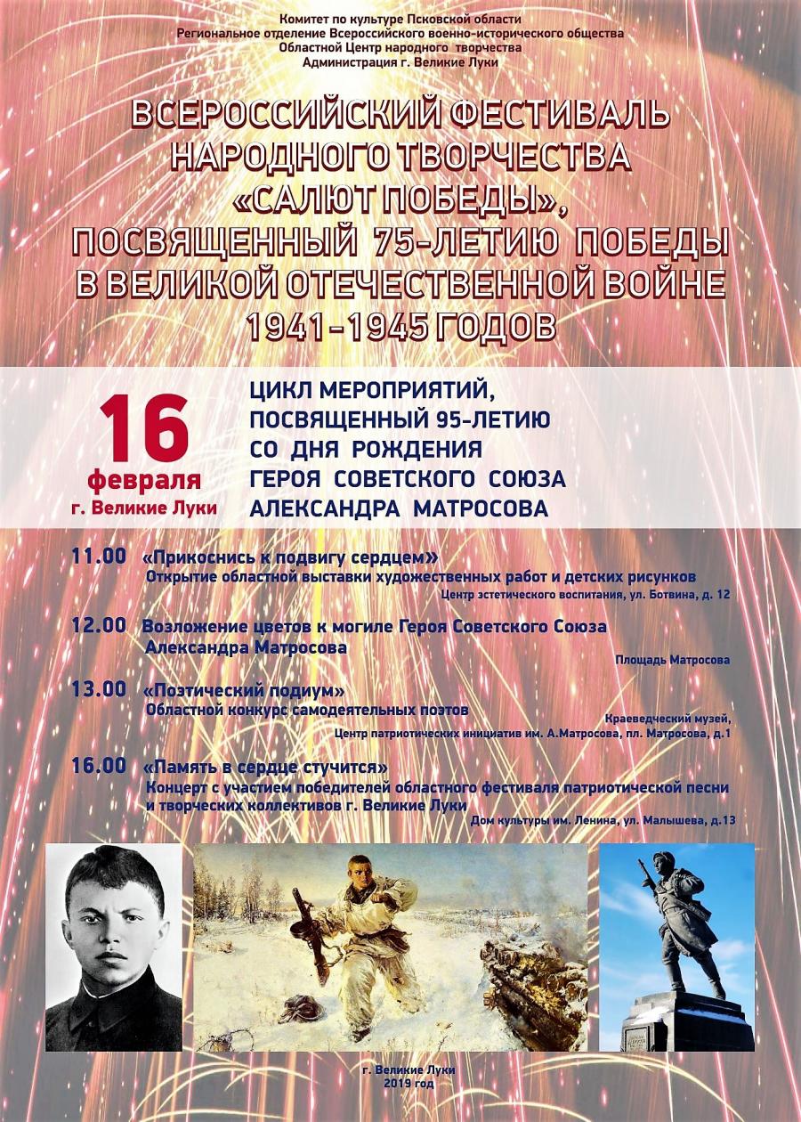 Фестиваль народного творчества "Салют Победы" открывается в Великих Луках циклом мероприятий, посвященных 95-летию со дня рождения Героя Советского Союза Александра Матросова.