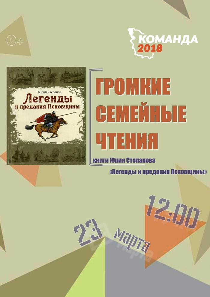 23 марта 2019 года в 12.00 одновременно в разных библиотеках Псковской области пройдут чтения книги Ю.В. Степанова «Легенды и предания Псковщины». В них примут участие семьи, члены которых внесли значимый вклад в развитие региона.
