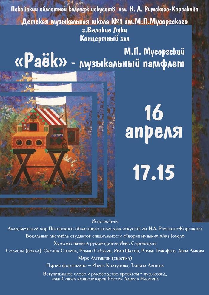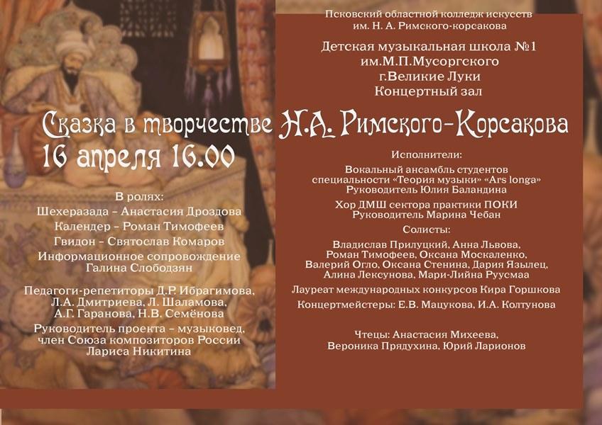 Так, 16 апреля в 16.00 состоится показ концерта «Сказка в творчестве Н.А. Римского-Корсакова», а в 17.15 зрителям покажут музыкальный памфлет М.П. Мусоргский «Раёк» в исполнении студентов Псковского областного колледжа искусств им. Н.А. Римского-Корсакова. (6+)