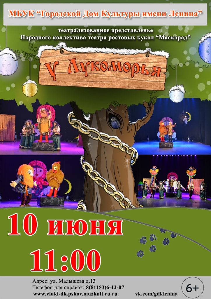 В дни летних каникул Городской Дом культуры имени Ленина приглашает великолучан и гостей города театрализованное представление народного коллектива театра ростовых кукол «Маскарад» - «У Лукоморья», по мотивам произведений А. С. Пушкина. Представление состоится 10 июня в 11:00, в концертном зале Городского Дома культуры имени Ленина.