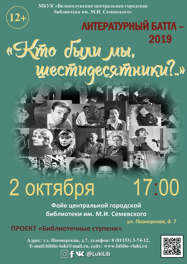 Великолукская центральная городская библиотека им. М.И. Семевского приглашает принять участие в литературном баттле «Кто были мы, шестидесятники?..», который состоится в Великих Луках уже в третий раз.