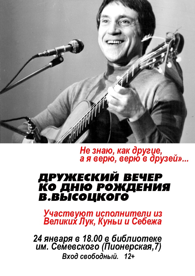 В песнях и стихах Владимира Высоцкого есть то, что уже многие годы излучает тепло и свет: любовь и дружба, мужество и ответственность, нежность и верность. Приглашаем всех желающих 24 января в 18.00 в конференц-зал Центральной городской библиотеки им. М.И. Семевского на дружеский вечер ко дню рождения Владимира Высоцкого, где примут участие исполнители из Великих Лук, Куньи и Себежа.