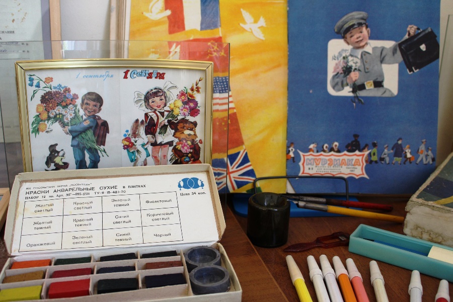 Представлены экспонаты из личной коллекции Ольги Мурашевой, первый звонок для которой прозвенел 1 сентября 1980 года: поздравительные открытки, самые ранние из которых датированы 50-ми годами прошлого века, школьные тетради, прописи, где писали пером и чернилами, учебники, календари, школьная форма и многое другое.