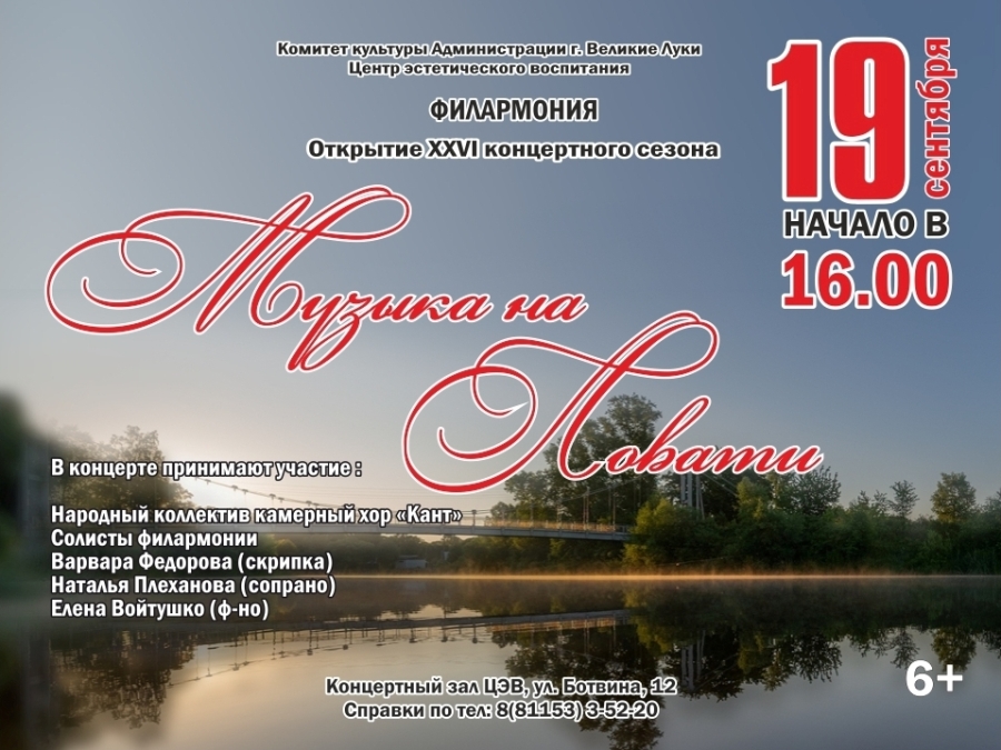 Открывается новый сезон концертом наших великолукских исполнителей «Музыка на Ловати». В этот вечер для слушателей прозвучат произведения мировых классиков, а также современная хоровая, вокальная музыка и народные песнив исполнении Народного коллектива камерного хора «Кант», солистов филармонии Натальи Плехановой(сопрано), Варвары Федоровой (скрипка) и Елены Войтушко (фортепиано).