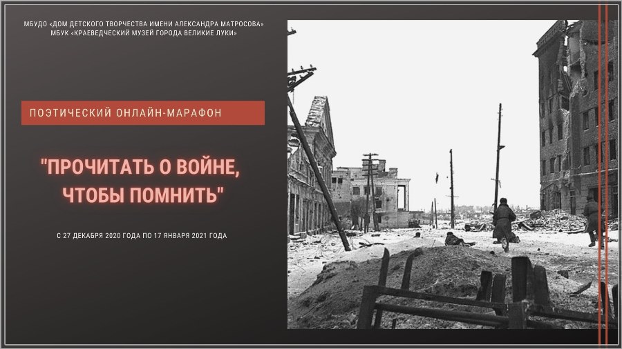 В преддверии праздника предлагаем принять участие в данном онлайн - марафоне чтецов, посвященном Дню освобождения города Великие Луки от немецко-фашистских захватчиков. Пусть чтение в сети напомнит всем о наших земляках, родных и близких, предоставляя еще одну возможность сохранить память о подвиге поколения победителей!