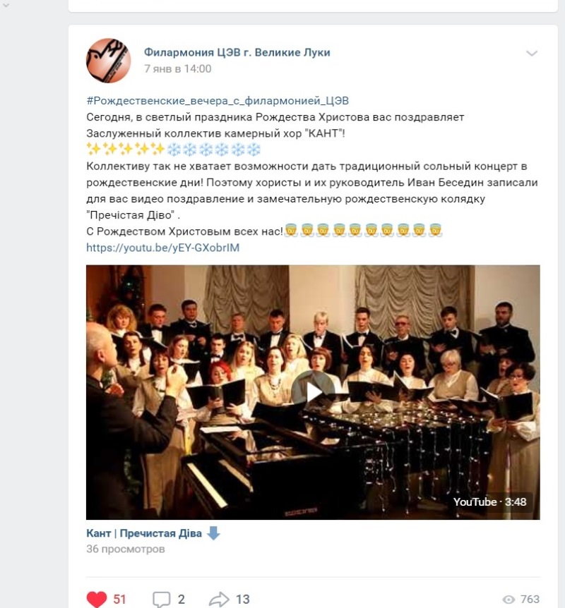 С 1 по 13 января в Центре эстетического воспитания прошел праздничный онлайн-флешмоб «Рождественские вечера с филармонией ЦЭВ»