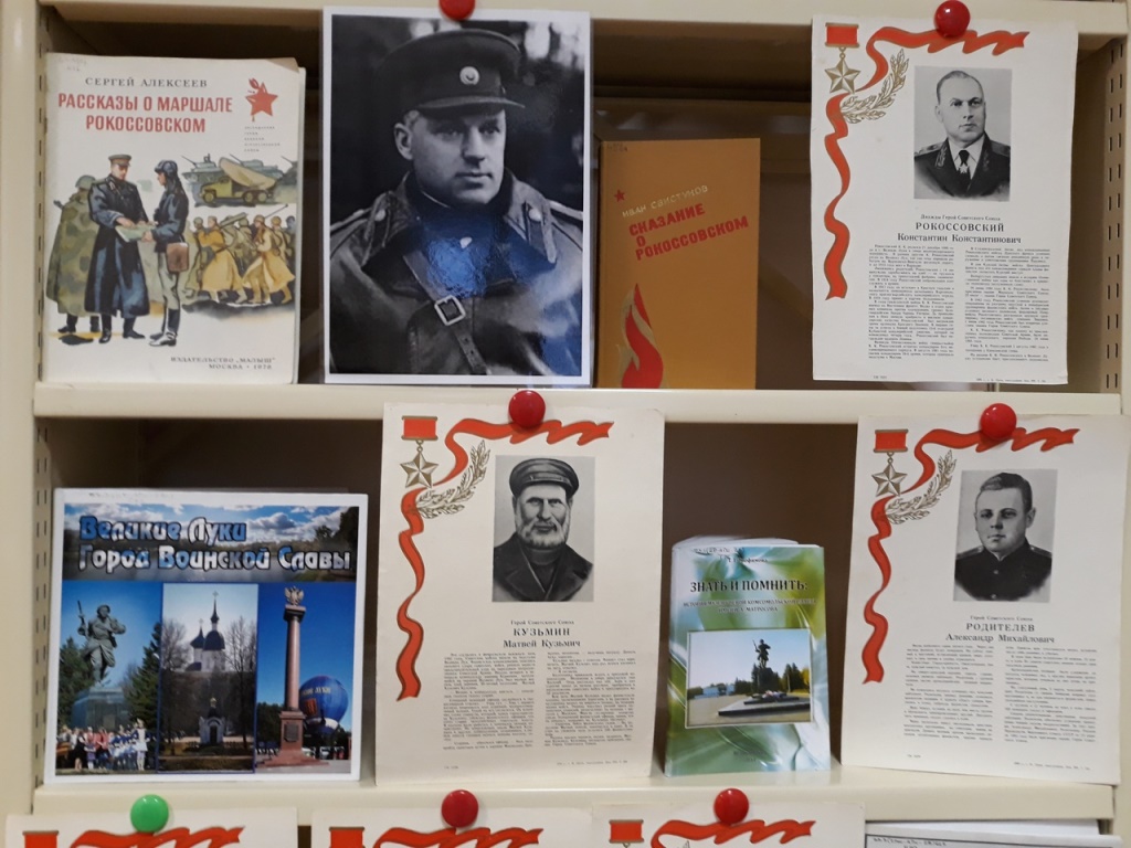 На выставке представлены книги и о наших героях земляках: А.Я.Арсеньев, А.П.Арсеньева «Псковичи – Герои Советского Союза», С.Алексеев «Рассказы о маршале Рокоссовском», И.Свистунов «Сказание о Рокоссовском», В.Смородов «Ступинский бастион», многотомный сборник «Солдаты Победы. Псковичи – участники Великой Отечественной войны 1941 – 1945 гг.»,сборник «Сороковые, роковые».