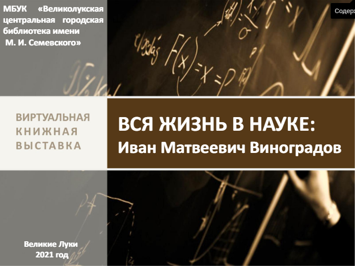 В этот день нельзя не вспомнить академика, выдающегося математика 20 века, нашего земляка Ивана Матвеевича Виноградова. Иван Матвеевич был значимым организатором российской науки, создателем и бессмертным руководителем с 1932 года математического института имени В. А. Стеклова. Деятельность академика оказала мощнейшее влияние на работу математиков во всем мире. Предлагаем Вашему вниманию виртуальную книжную выставку «Вся жизнь в науке: Иван Матвеевич Виноградов», созданную на основе изданий из фондов Великолукской центральной библиотеки им. М. И. Семевского. Выставка познакомит Вас не только с книгами выдающегося математика, но и с изданиями в которых опубликованы материалы о самом академике, и о Мемориальном доме-музее им. И. М. Виноградова.