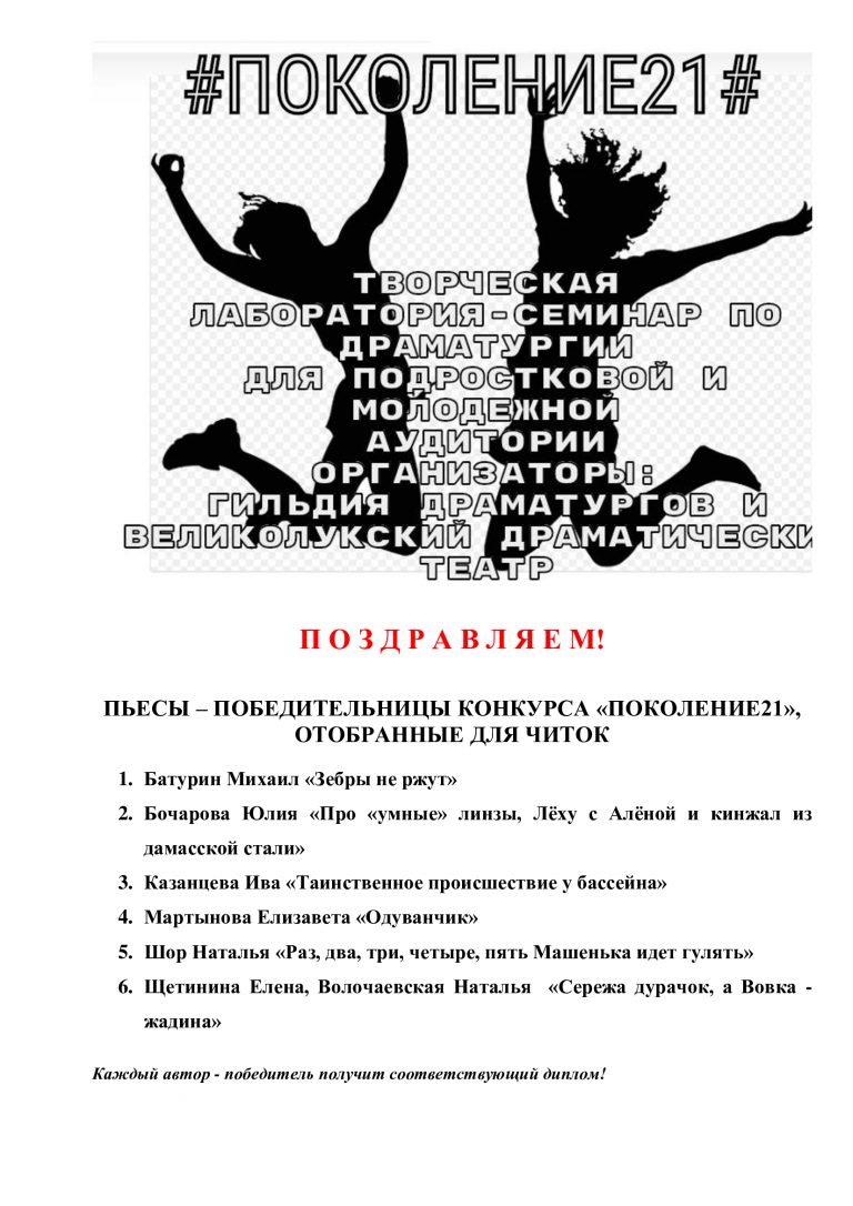 Великолукский драматический театр совместно с Гильдией драматургов России в рамках творческой лаборатории-семинара по драматургии для подростков и молодежи #ПОКОЛЕНИЕ21#, приглашают великолучан, любителей и почитателей театрального искусства с8 по 11 апреля 2021 года стать участником уникальных лекций, мастер-классов, читок пьес.