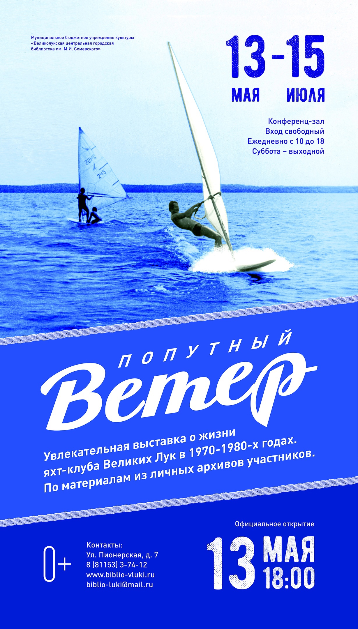 Гости презентации смогут познакомиться с историей яхт-клуба «Чайка», который был организован в Великих Луках в 1967 году. Будут представлены фотографии, документы, медали, личные вещи из семейных архивов участников клуба, которые выступали за город на областных соревнованиях, выезжали на всесоюзные соревнования, завоевывали звания кандидатов и мастеров спорта. На встрече выступит зам. капитана яхт-клуба Козловский Георгий Петрович, стоящий у истоков его создания, куратор Васильева Екатерина, дочь Алексеева Леонида Николаевича, и многие другие, для которых парусный спорт - это бесконечный мир контрастов между экстримом и расслабленным отдыхом, насыщенными гонками и неспешным пересечением огромных водных просторов, жарой и холодом, безудержным весельем и напряжением.