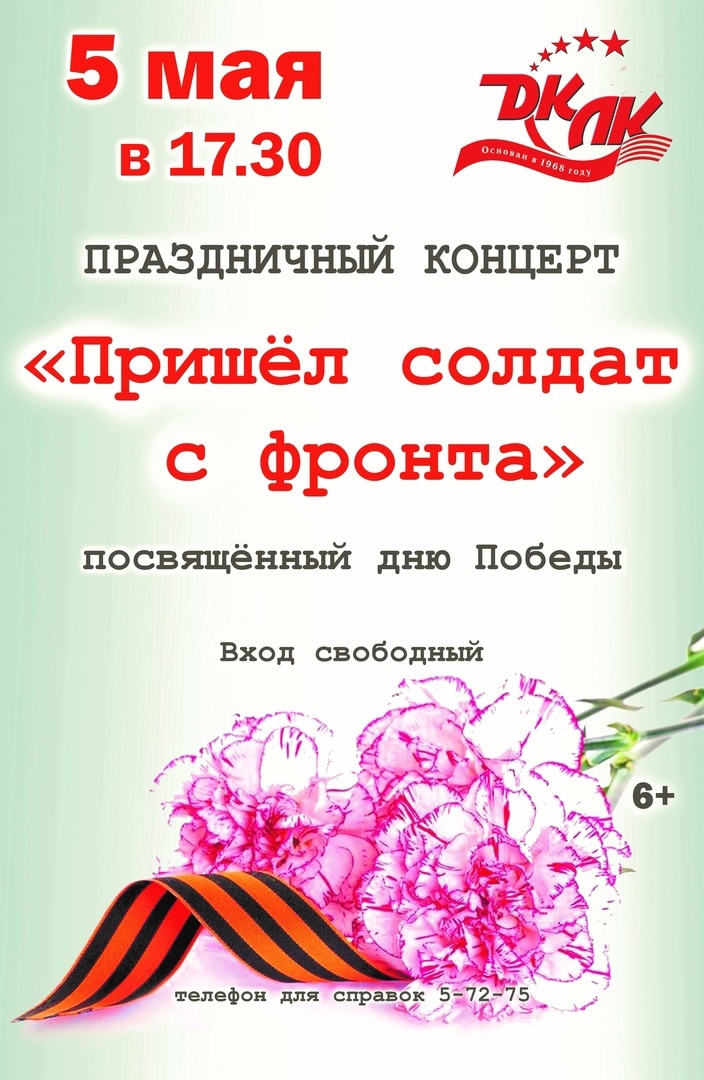 5 мая в 17.30 в Доме культуры Ленинского комсомола состоится концерт «Пришел солдат с фронта», посвященный Дню Победы!