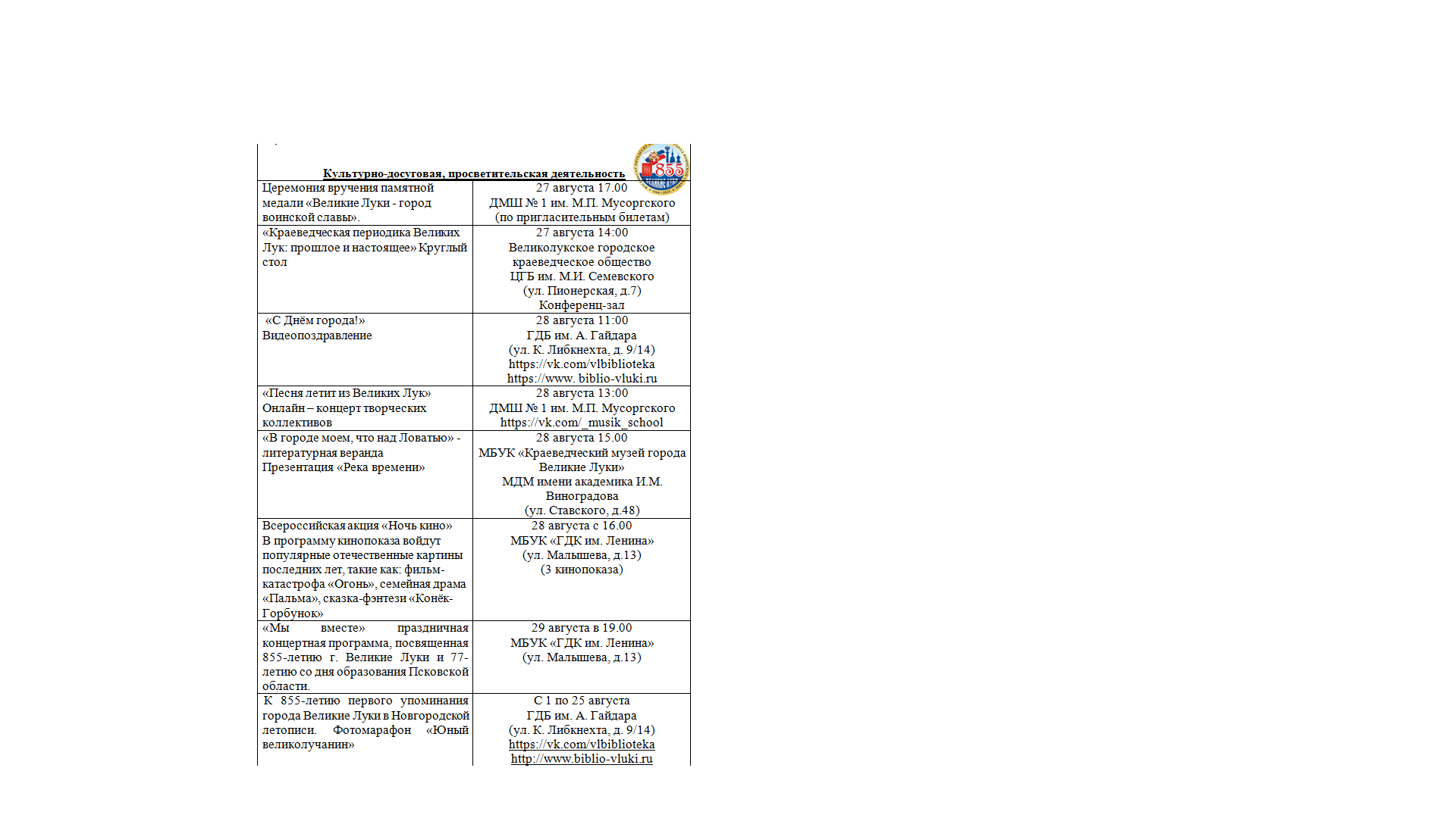 Праздничные мероприятия, посвященные 855-летию упоминания в летописи города Великие Луки