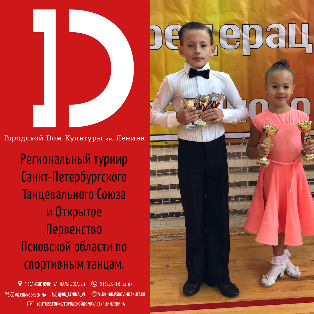 Региональный турнир Санкт-Петербургского Танцевального Союза и Открытое Первенство Псковской области по спортивным танцам. 25 сентября участники Образцового коллектива студии спортивного бального танца «Созвездие», руководитель Мария Глазычева, приняли участие сразу в двух турнирах. Федорова София выступила на региональном турнире Санкт-Петербургского Танцевального Союза и заняла почетное 2 место в категории дебют. Параллельно в городе Псков проходило Открытое Первенство Псковской области в турнире по спортивным танцам. Где Глазычева Василиса и Цветков Роман в сольных и дуэтных выступлениях были оценены членами судейской коллегии множественными дипломами и кубками призовые места в различных танцевальных категориях. Поздравляем руководителя и участников коллектива с заслуженными наградами, желаем новых достижений и побед.