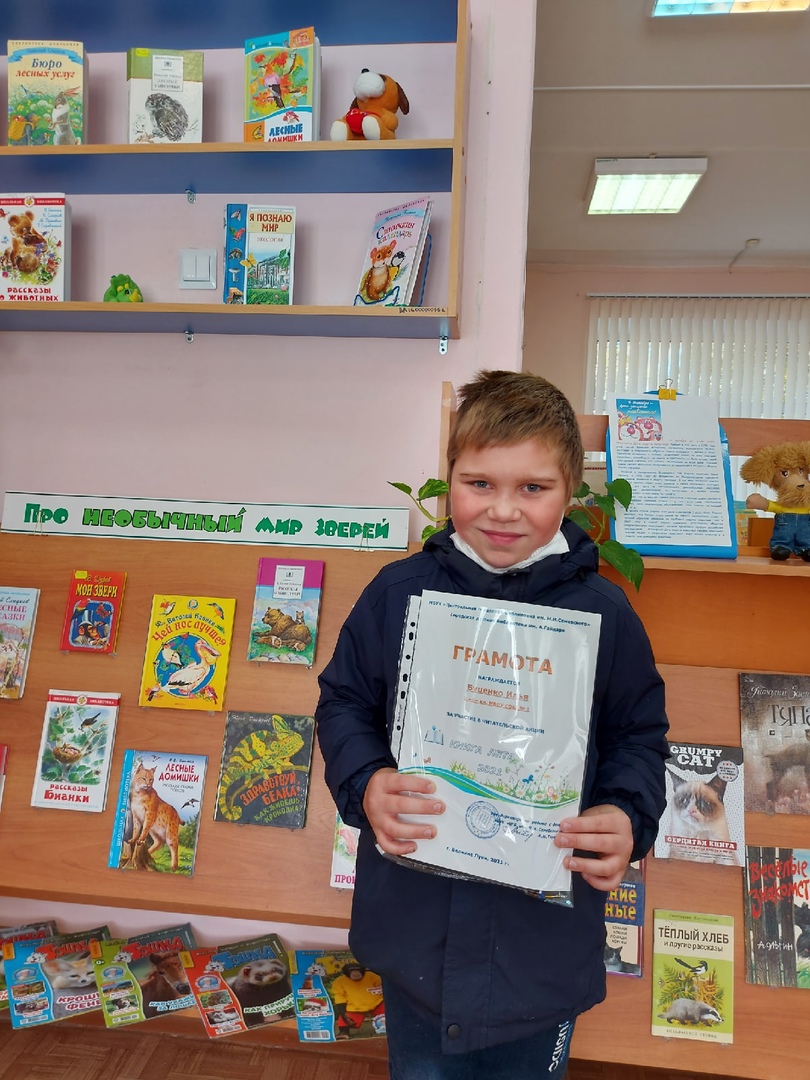 Шесть читателей отмечены Грамотами и призами за участие в акции. Это Миронова Анастасия (5 «Г» кл. лицей № 11), она предложила участникам группы познакомиться с книгой Г.Троепольского «Белый Бим Чёрное Ухо» и сделала видеролик по книге. Левченкова Елизавета из 3 «Б» кл. школы № 13 нарисовала иллюстрацию к сказочной повести Н.Носова «Приключения Незнайки и его друзей», Иванова Анисья из 2 «А» кл. школы № 13 вместе с мамой нарисовала Жар – птицу к сказке П.Ершова «Конёк – Горбунок». Буценко Илья из 3 «Б» кл. школы № 1 проиллюстрировал фрагмент повести В.Медведева «Баранкин, будь человеком!». Фёдорова Софья из 1 «В» класса школы № 7 вместе с мамой сделала поделку к сказке Х.К.Андерсена «Дюймовочка» и рассказала о своей домашней библиотеке. Фёдоров Владислав из 6 «В» кл. школы № 7 создал композицию к книге Д.Дефо «Робинзон Крузо».