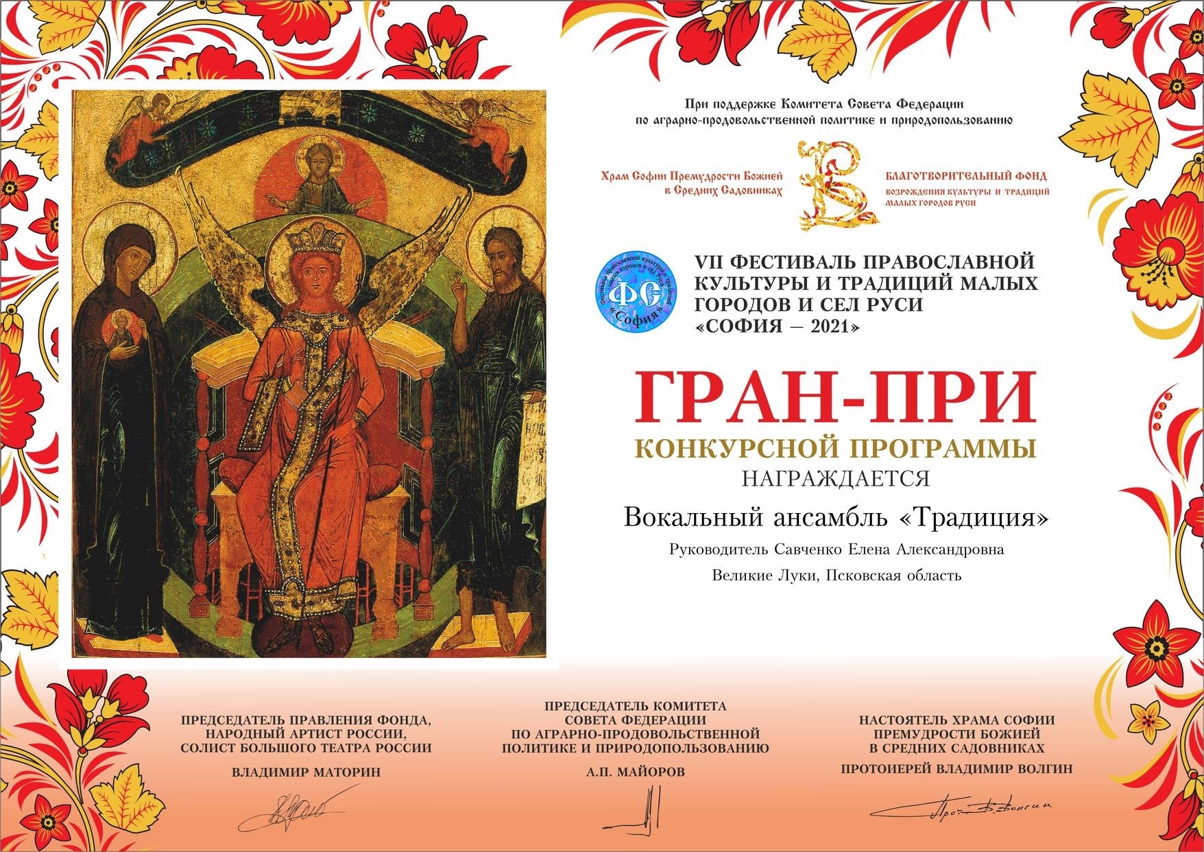 Народный коллектив вокальный ансамбль «Традиция» МБУК "ГДК им. Ленина" (руководитель, обладатель Почетного звания «Душа земли Псковской» - Елена Александровна Савченко) удостоен диплома «ГРАН-ПРИ» в VII Фестивале православной культуры и традиций малых городов и сельских поселений Руси «София-2021».