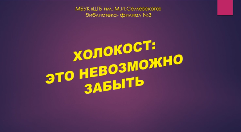 Предлагаем вашему вниманию видео-презентацию «Холокост: это невозможно забыть» https://vk.com/video/@kniguvsemju?z=video-172185922_456239060%2Fclub172185922%2Fpl_-172185922_-2