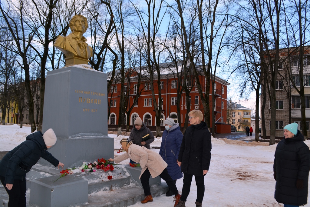 Сотрудники муниципальных библиотек города Великие Луки собрались в сквере им. А.С. Пушкина, чтобы ещё раз сказать слова благодарности и возложить цветы к бюсту поэта. В этот день для декламации было выбрано стихотворение «Простите, верные дубравы!..»