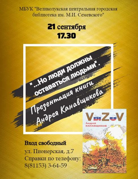 21 сентября в 17.30 в конференц-зале Центральной городской библиотеки им. М.И. Семевского (ул. Пионерская, д. 7, 8(81153)3-64-59) состоится презентация новой книги «VыZоV» члена Союза писателей России, заместителя председателя правления Псковского регионального отделения Союза писателей России, лауреата ряда литературных премий, победителя и дипломанта всероссийских конкурсов и фестивалей, члена-корреспондента Петровской академии наук и искусств, члена Союза журналистов России, председателя Литературно-художественной творческой группы «Рубеж», заслуженного работника средств массовой информации Псковской области Андрея Борисовича Канавщикова.