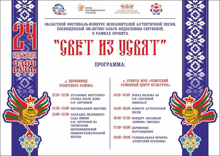 На протяжении года в рамках проекта «Свят из Усвят» при поддержке Псковского областного центра народного творчества проходили мероприятия, посвященные 100-летию со дня рождения Ольги Федосеевны Сергеевой, усвятской исполнительницы фольклорных песен.
