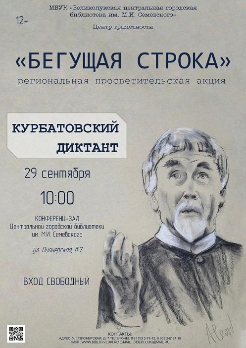 Центр грамотности Великолукской центральной городской библиотеки им. М.И. Семевского приглашает великолучан принять участие в региональной просветительской акции Курбатовский диктант «Бегущая строка», посвящённой 83-летию со дня рождения выдающегося литературного критика, литературоведа, прозаика, члена Союза писателей России, члена Президентского Совета по культуре, лауреата Государственной премии Российской Федерации Валентина Курбатова. Инициатором акции является ГБУК «Псковская областная универсальная научная библиотека им. В.Я. Курбатова».