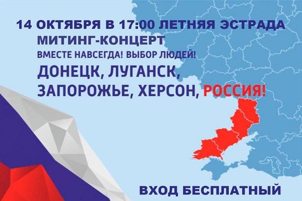 14 октября в Великих Луках на летней эстраде пройдет митинг-концерт в поддержку итогов референдумов, а также в поддержку участников Специальной военной операции. Жители Донецка, Луганска, Херсона и Запорожья высказались за то, чтобы войти в состав России. Сегодня их выбор - быть вместе в Россией - героически защищают наши военнослужащие и ополченцы Донбасса.