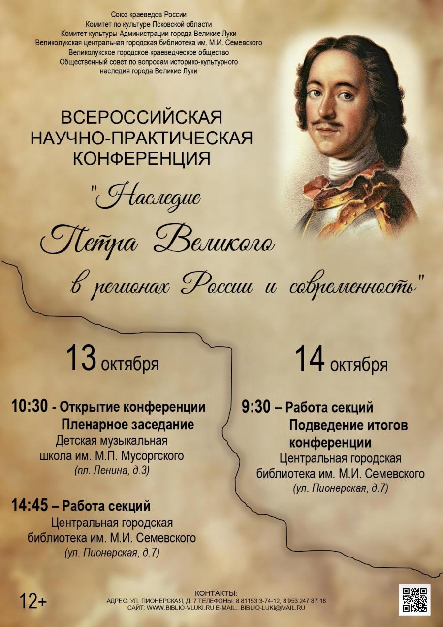 Друзья, 13 и 14 октября 2022 года в Великих Луках состоится Всероссийская научно-практическая конференция «Наследие Петра Великого в регионах России и современность», посвященная 350-летию со Дня рождения Петра I.