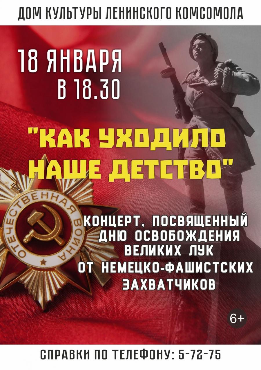 18 января в 18:30 приглашаем на концерт с участием творческих коллективов Дома культуры Ленинского комсомола и великолукских исполнителей.