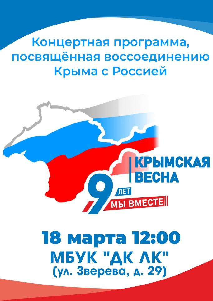 Приглашаем на концертную программу, посвященную воссоединению Крыма с Россией "Крымская весна - 9 лет мы вместе".