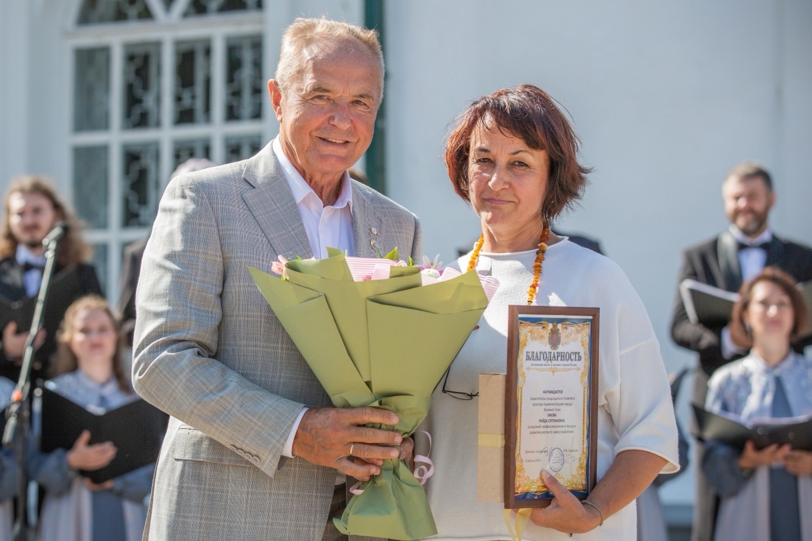 Награду получила администратор МБУК «Великолукский драматический театр» Татьяна Леонидовна Захарова. Также были вручены Благодарственные письма Главы города директору МБУ ДО «Детская художественная школа имени А.А. Большакова» Александре Олеговне Вдовиной и заместителю директора по АХЧ МБУК «Центральная городская библиотека имени М.И. Семевского» Алевтине Викторовне Смирновой.