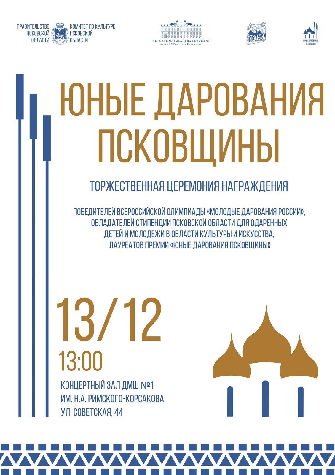13 декабря Лауреаты премии «Юные дарования Псковщины» примут участие в Торжественной Церемонии награждения и концерте победителей.