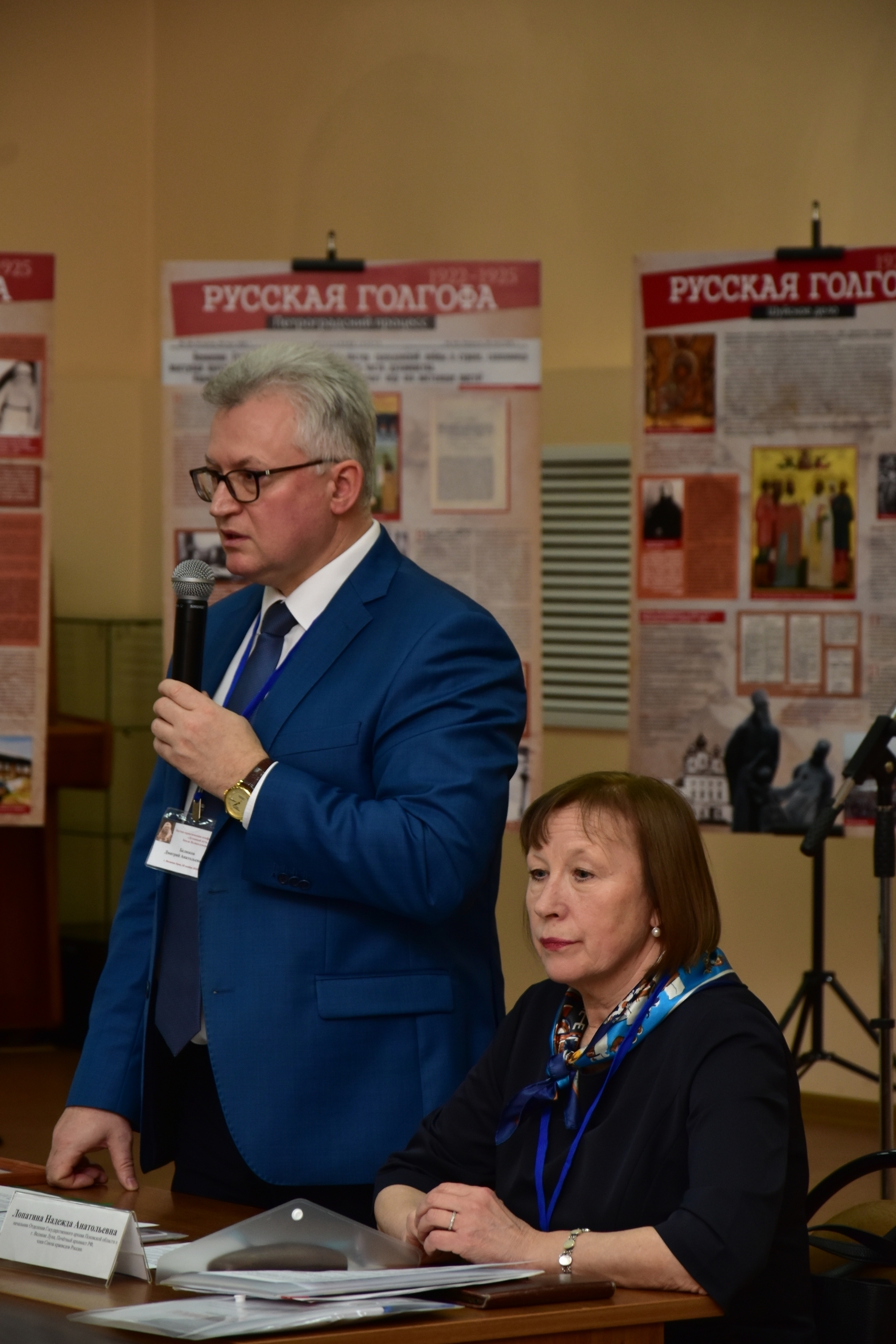 С программным докладом выступил Дмитрий Анатольевич Белюков, кандидат исторических наук, доцент, декан Великолукской государственной академии физической культуры и спорта, Почётный работник сферы образования РФ, член Совета Союза краеведов России (СКР), сопредседатель Великолукского городского краеведческого общества, председатель Общественного совета по вопросам историко-культурного наследия (Великие Луки). Он рассказал про успешный опыт 10-летнего сотрудничества Великолукского городского краеведческого общества и Великолукской епархии с 2016 года и основных мероприятиях десятилетия.